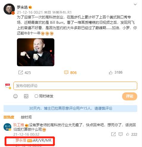 除此之外他并未透露更多信息,但这已足够引发外界遐想。媒体们一窝蜂地转发报道,宣布罗永浩将进军 AR 和 VR。他的微博评论区也久违地热闹起来,讲段子的、唱衰的、嘲讽的,喊着“龙哥牛X”的……在当下一片忧愁的科技新闻中,这可能是少有的能够引发人们好奇与调侃的消息了。