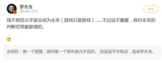不过,罗永浩却并不认可元宇宙。10 月底,他在微博回复网友称,他不相信元宇宙会成为未来(游戏只是游戏)。但没过几天,他又对外说,“我们未来在科技行业要做的很多事,都会不可避免地走向元宇宙,不管是否愿意。从这个角度出发,我们的下一个创业项目,竟然也是一家所谓的‘元宇宙公司’。”