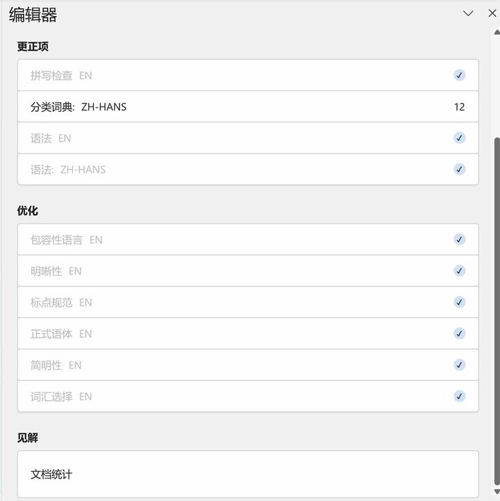 如果说上面提到的功能已经成为了独当一面的勇士,那 Microsoft 编辑器只能算是一个初出茅庐的新人。我非常期待这一功能在未来的表现,但至少在现在,或者说在中文环境中,它还不够好用。