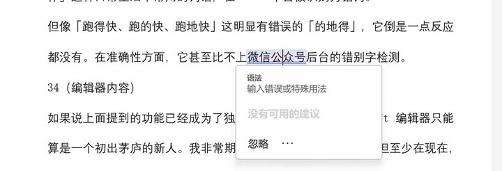 但像「跑得快、跑的快、跑地快」这明显有错误的「的地得」,它倒是一点反应都没有。在准确性方面,它甚至比不上微信公众号后台的错别字检测。