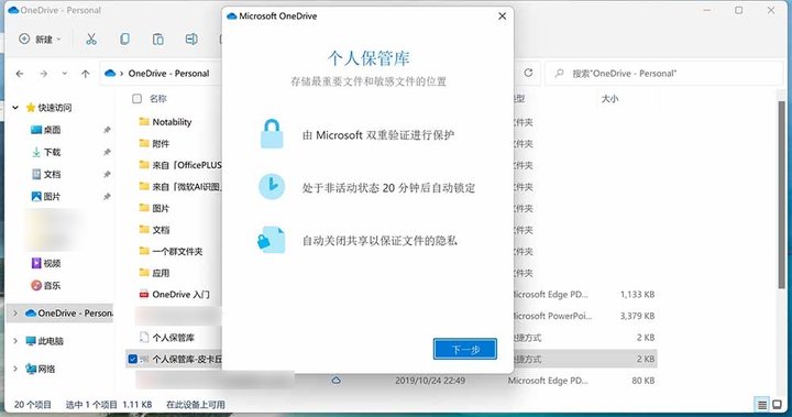 另外,OneDrive 的在 19 年推出的个人保管箱功能也非常实用,这是 OneDrive 里一个受保护的区域,你可以把最重要、最敏感的文件放到个人保管箱中。