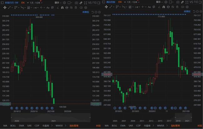 但第一季度,也是腾讯、阿里双雄在 2021 年最高光的阶段。从二季度开始,受一系列不利因素影响,两大巨头股价每况愈下。腾讯从年内高点 773.9 港元一路下滑,年内共有 7 个月收阴;阿里有过之而无不及,港股股价较 1 月份的年内高点 301.6 港元跌去 60%,2021 年已有 11 个月收跌。
