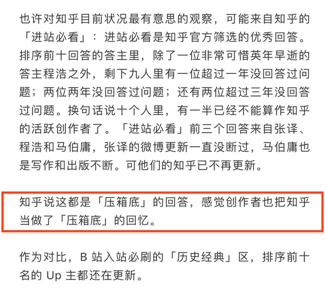 文中的一段是这么写的,“‘进站必看’是知乎官方筛选的优秀回答。排序前十回答的答主里,除了一位非常可惜英年早逝的答主程浩之外,剩下 9 人里有一位超过一年没回答过问题;两位两年没回答过问题;还有两位超过三年没回答过问题。换句话说 10 个人里,有一半已经不能算作知乎的活跃创作者了。’进站必看’前三个回答来自张译、程浩和马伯庸,张译的微博更新一直没断过,马伯庸也是写作和出版不断。可他们的知乎已不再更新”。