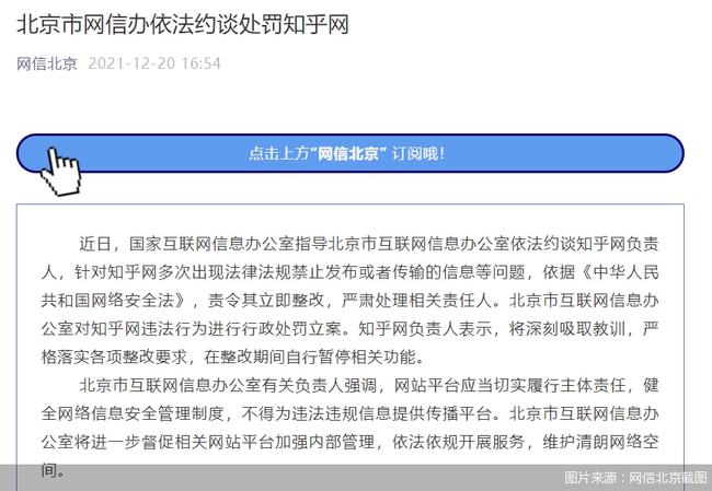 12 月 20 日,北京市网信办通过官方微信公众号宣布,近日,国家网信办指导北京市网信办依法约谈知乎网负责人,针对知乎网多次出现法律法规禁止发布或者传输的信息等问题,依据《中华人民共和国网络安全法》,责令其立即整改,严肃处理相关责任人。北京市网信办对知乎网违法行为进行行政处罚立案。